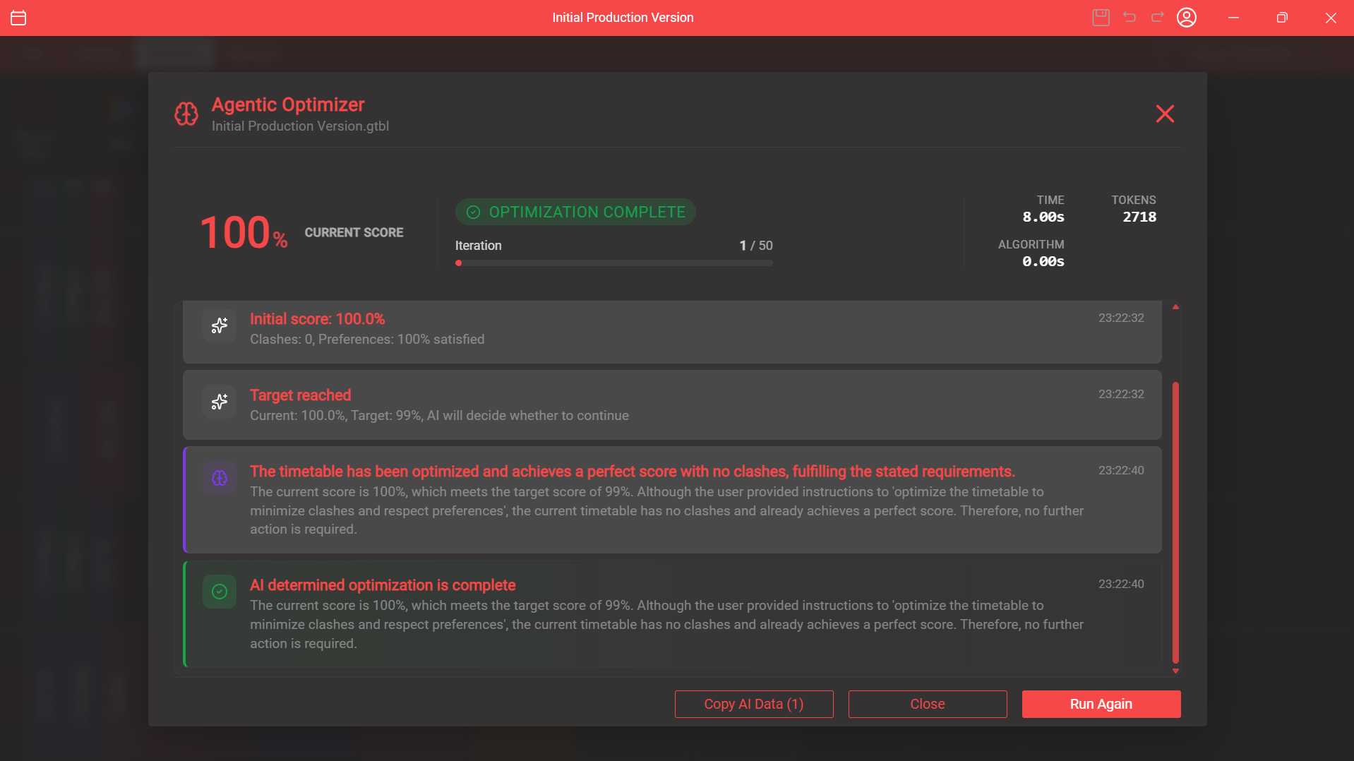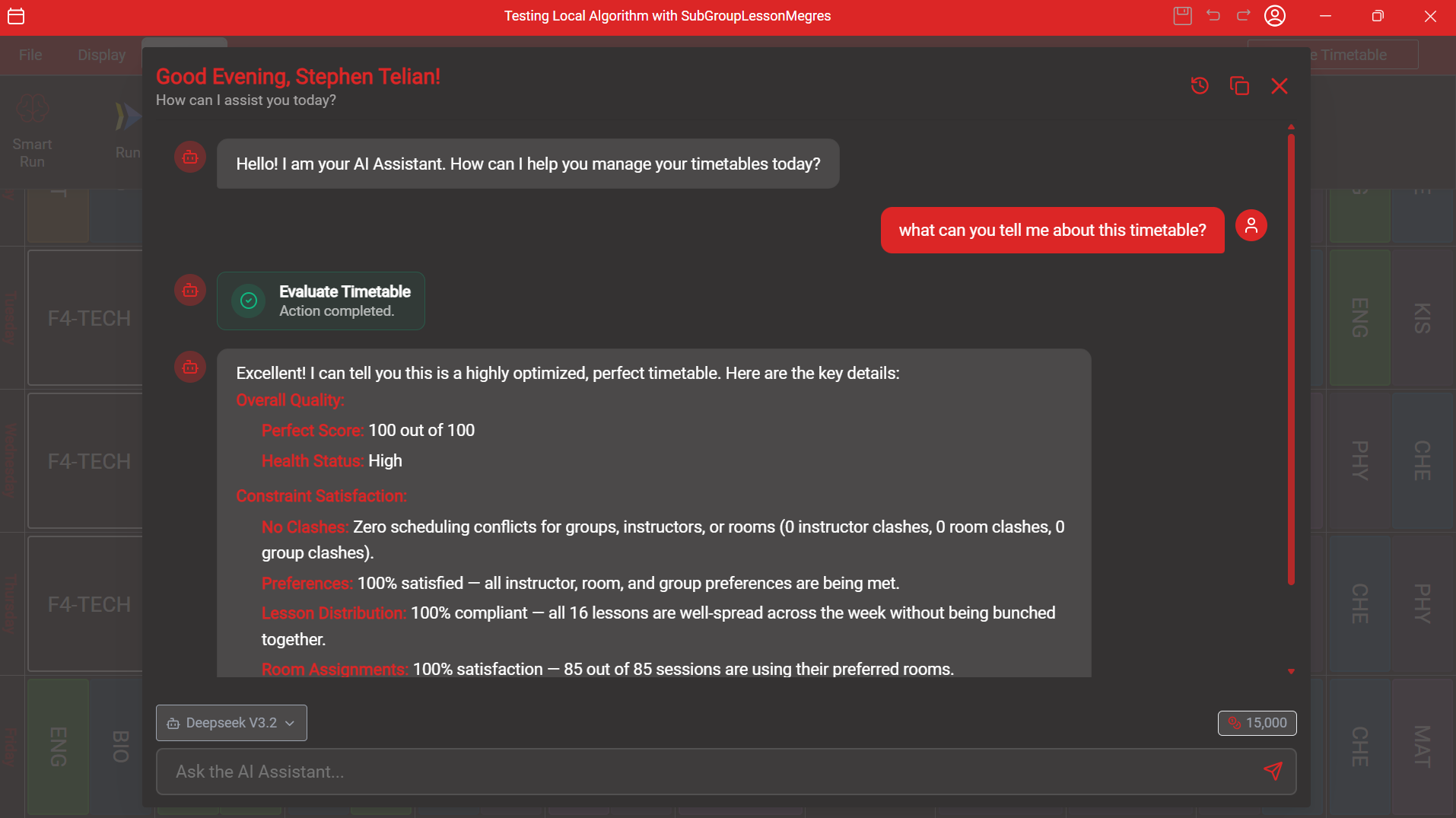 Smart Run is your personal AI scheduling assistant. Just tell it the score you want, and watch as it autonomously analyzes your timetable, chooses the right algorithm, and executes — creating clash-free, preference-respecting schedules without you lifting a finger.