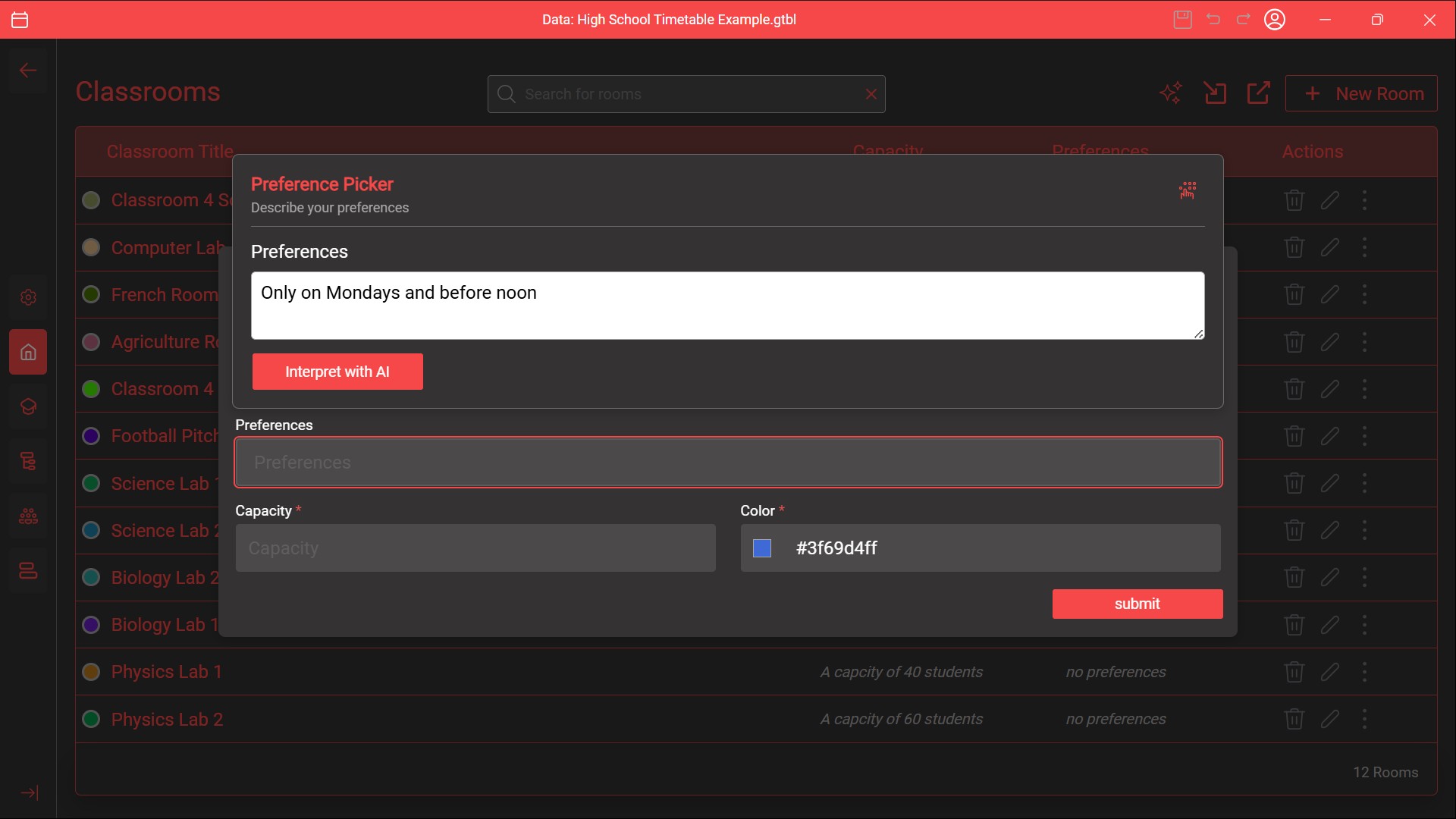 Already have your teachers, rooms, and classes in a spreadsheet? Perfect! Just import your Excel file and our smart parser will do the heavy lifting. We even support AI-powered conversion of natural language preferences into scheduling rules.