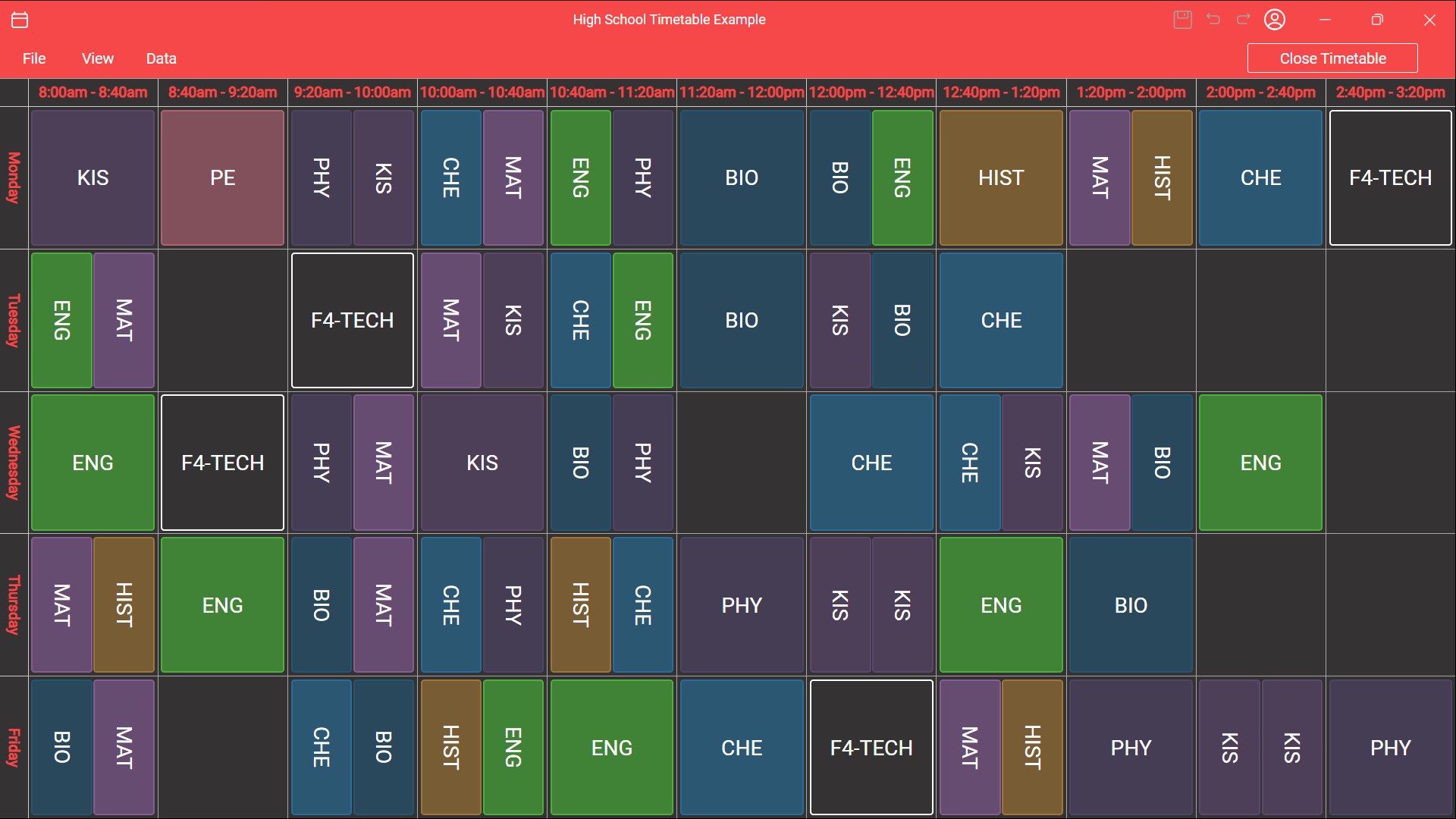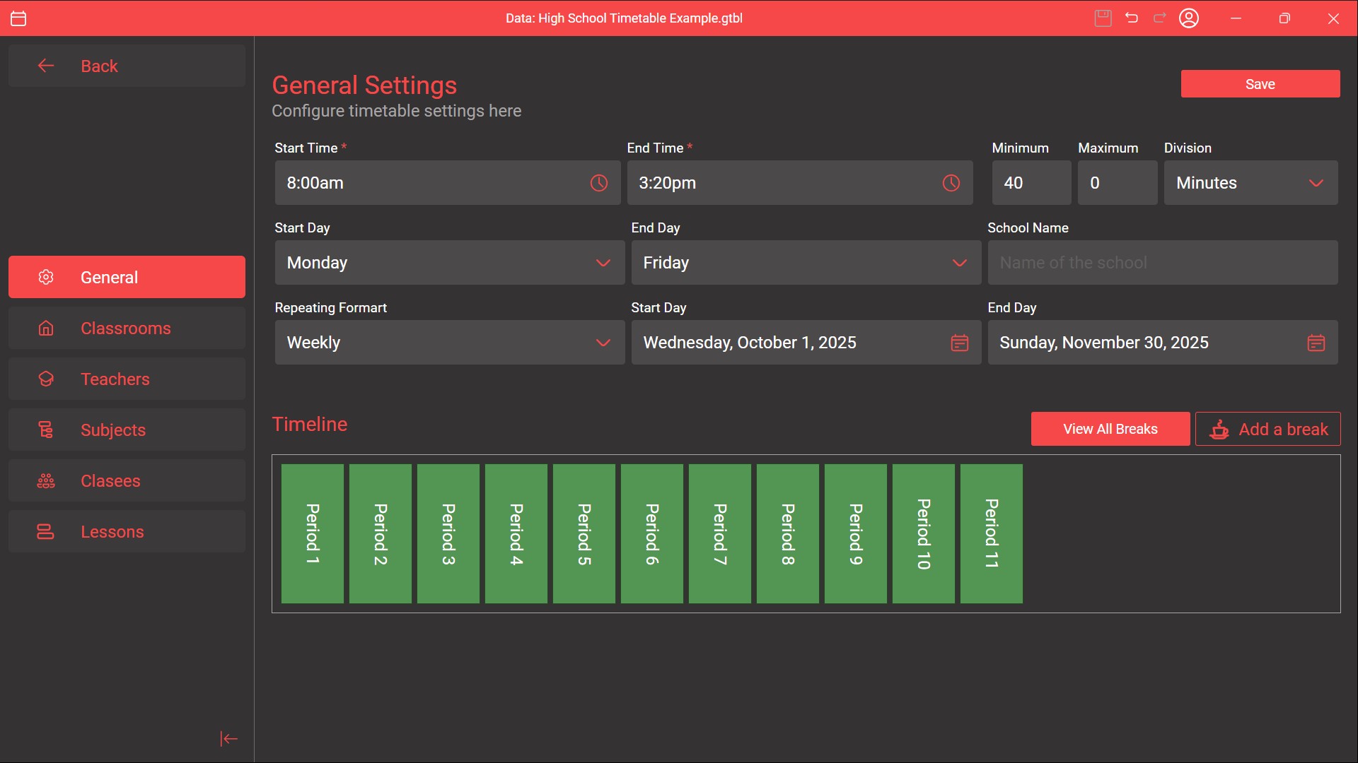 Configure breaks, start/end days, and general settings from a centralized data screen. Keep all your timetable parameters organized.