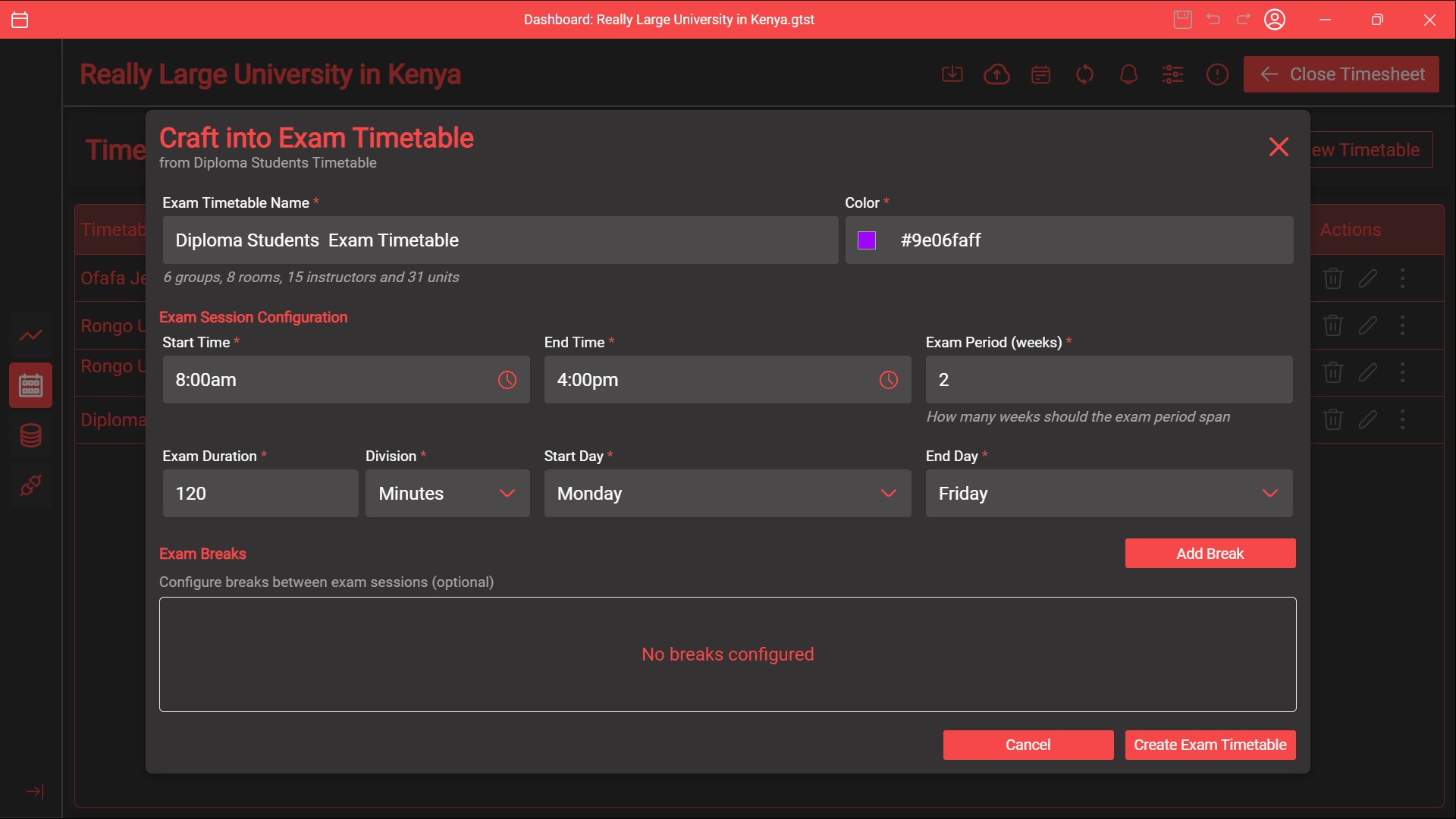 Transform your regular timetable into an exam schedule with our Timesheets feature. Automatically consider exam constraints and room capacities.