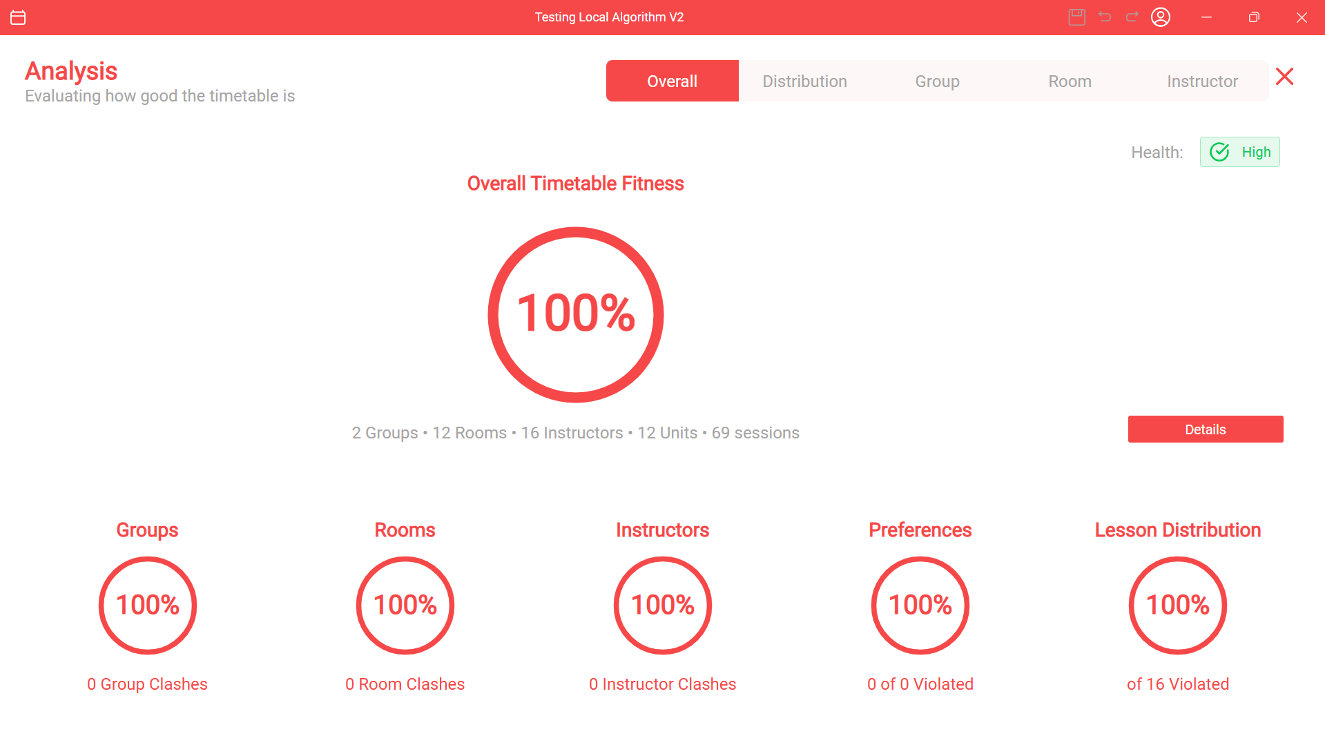 Stop guessing whether your timetable is good. The Quality Evaluator provides a 0-100 score based on hard constraints (60%), preferences (20%), distribution (10%), and room usage (10%).