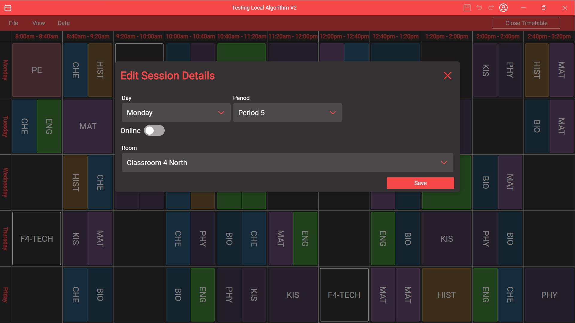Move sessions effortlessly by dragging them to new cells. In Balanced mode, change day and time. In Vertical mode, change day, time, AND room.