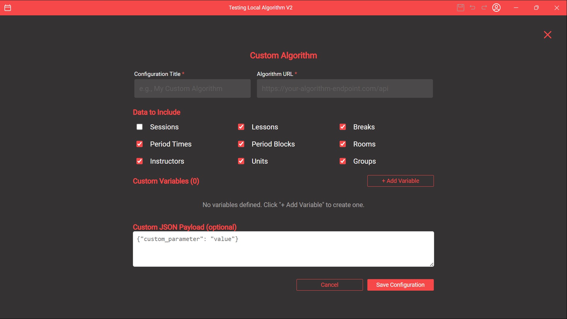 Write your own optimization algorithm and expose it via an API endpoint. The app sends your timetable data, and your algorithm returns optimized results.